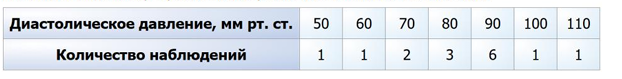 3) Вычислим среднее арифметическое: (50*1 + 60*1 + 70*2 + 80*3 + 90*6 + 100*1 + 110*1) / 15 = (50 + 60 + 140 + 240 + 540 + 100 + 110) / 15 = 1240 / 15 = 82,66 мм рт. ст. Это не равно 90. (Ложь).