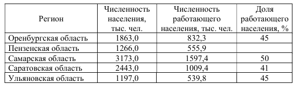 (Регион, Численность населения тыс. чел., Численность работающего населения тыс. чел., Доля работающего населения %: Оренбургская область, Пензенская область, Самарская область, Саратовская область, Ульяновская область)