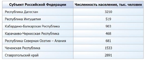 Таблица содержит данные о численности населения в субъектах РФ, расположенных в Северо-Кавказском федеральном округе (СКФО), по данным на 1 января 2023 г.