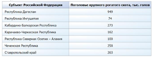 Найдите среднее поголовье крупного рогатого скота в данных субъектах РФ. Ответ дайте в тыс. голов с округлением до целого.
