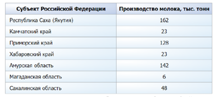 Таблица содержит данные о годовом производстве молока в 7 из 11 субъектов РФ, расположенных в Дальневосточном федеральном округе (ДВФО), по данным на 2020 г.