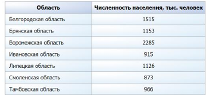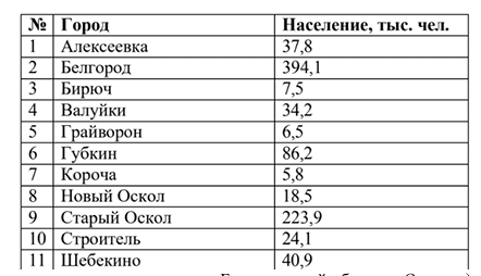 Белгородская область находится в юго-западной части Российской Федерации, граничит с Курской и Воронежской областями. В Белгородской области 11 городов. В таблице приведены данные о населении этих городов на 1 января 2020 г.