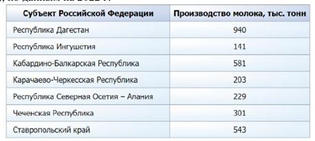 Таблица содержит данные о годовом производстве молока в субъектах РФ, расположенных в Северо-Кавказском федеральном округе (СКФО), по данным на 2022 г.