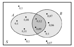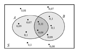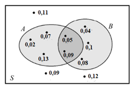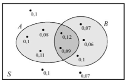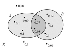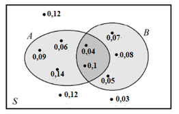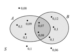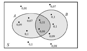 На диаграмме Эйлера изображён случайный опыт S, в котором 11 элементарных событий, показанных точками. Около каждого исхода подписана его вероятность. Найдите условную вероятность P(B|A).