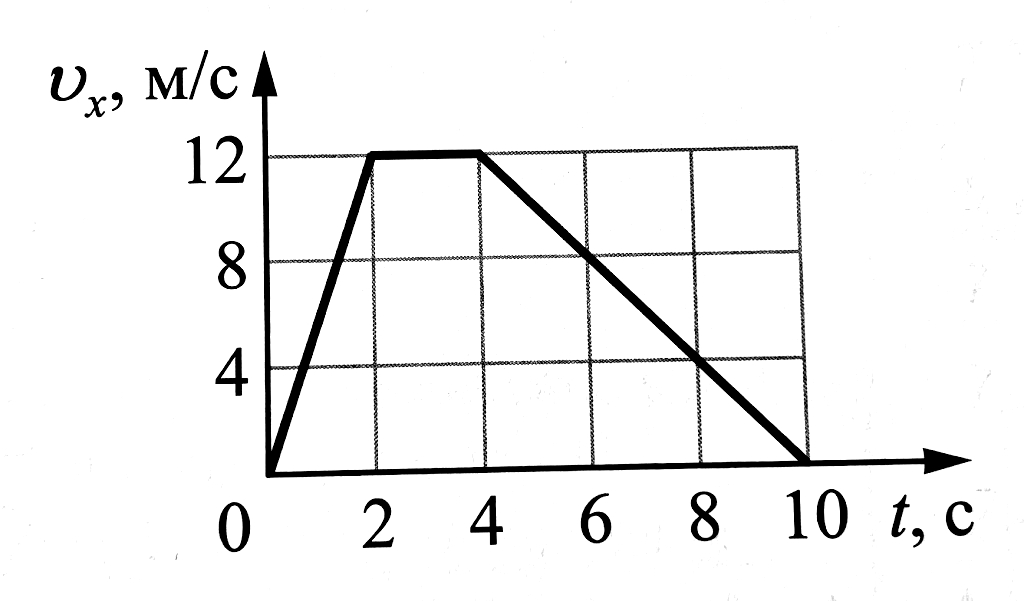 Первое задание направлено на проверку умения читать и анализировать кинематические графики. Ученику представлен график зависимости проекции скорости тела на ось X от времени. Требуется найти проекцию ускорения тела на заданном интервале времени (от 6 до 10 секунд). Для решения необходимо вспомнить формулу ускорения a = (v2 - v1) / (t2 - t1). Определив по графику начальную и конечную скорость на указанном промежутке, школьник рассчитывает градиент (наклон) прямой. Поскольку график идет вниз (скорость уменьшается с 12 м/с до 0 м/с), проекция ускорения будет отрицательной.