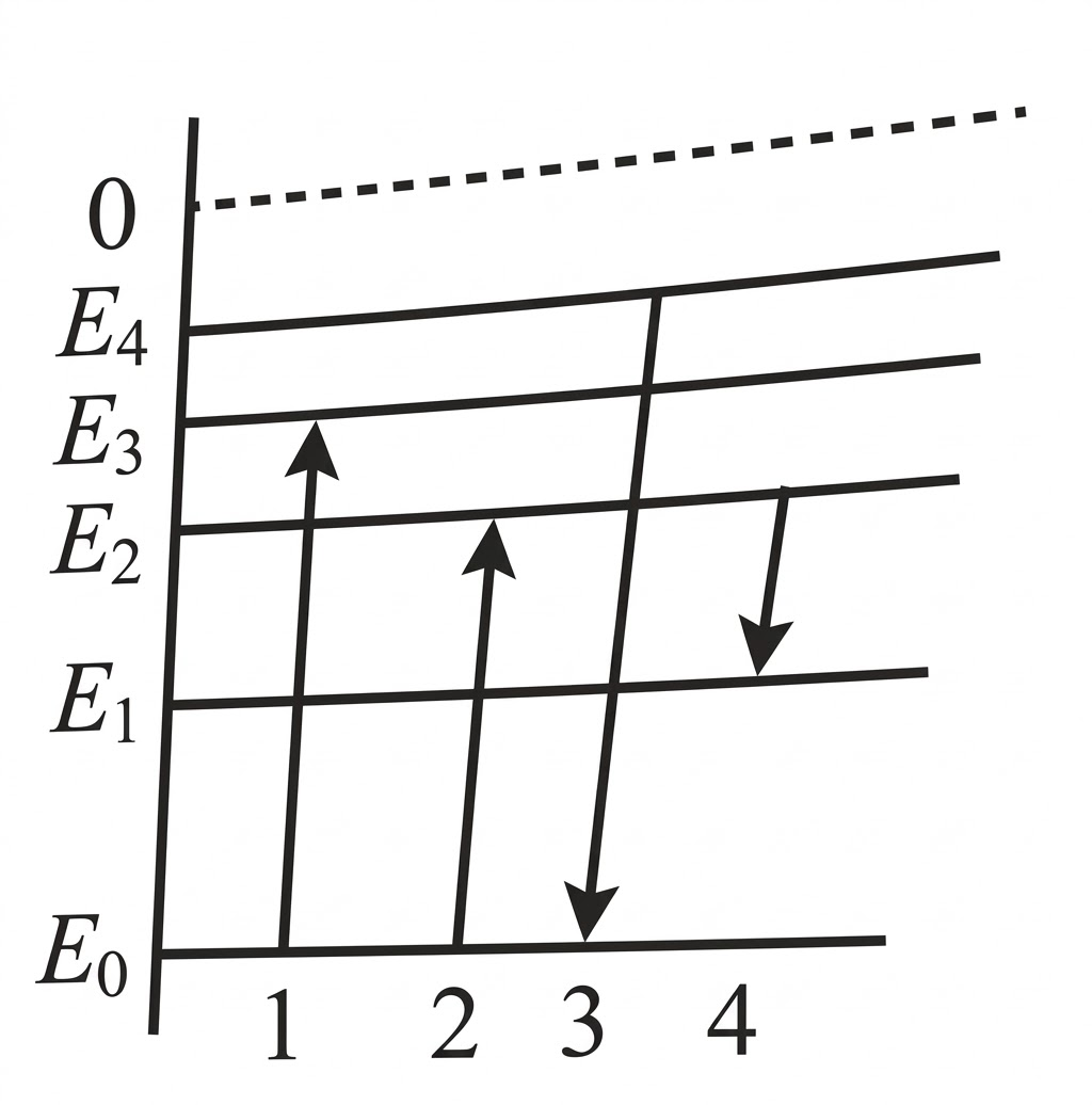 На рисунке изображена упрощённая диаграмма нижних энергетических уровней атома. Нумерованными стрелками отмечены некоторые возможные переходы атома между этими уровнями.