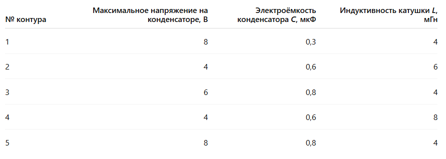 | № контура | Максимальное напряжение на конденсаторе, В | Электроёмкость конденсатора *C*, мкФ | Индуктивность катушки *L*, мГн |