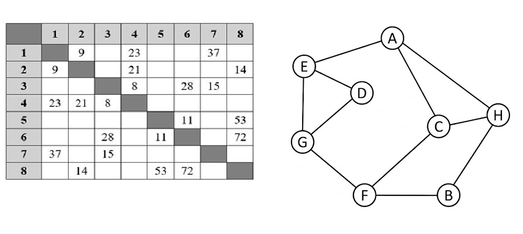 На рисунке схема дорог №-ского района изображена в виде графа, в таблице содержатся сведения о протяженности каждой из этих дорог (в километрах). Так как таблицу и схему рисовали независимо друг от друга, нумерация населённых пунктов в таблице никак не связана с буквенными обозначениями на графе. Определите, какова сумма протяжённостей дорого из пункта Н в пункт А и из пункта F в пункт G.