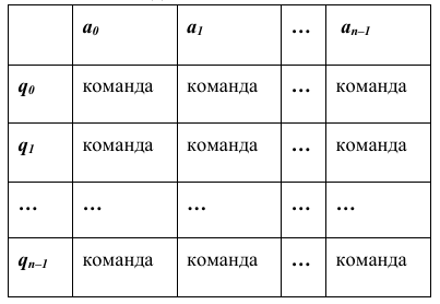 В первой строке перечислены все возможные символы в текущей ячейке ленты, в первом столбце возможные состояния головки. На пересечении i-й строки и j-го столбца находится команда, которую выполняет МТ, когда головка обозревает j-й символ, находясь в i-м состоянии. Если пара «символ состояние» невозможна, то клетка для команды остаётся пустой.