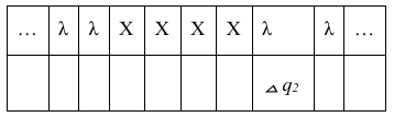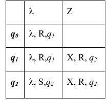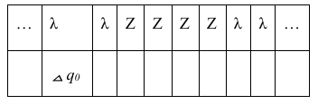 Приведём пример выполнения программы, заданной таблично. На ленте записано неизвестное ненулевое количество расположенных подряд в соседних ячейках символов «Z», все остальные ячейки ленты заполнены пустым символом «λ». В начальный момент времени головка находится на неизвестном расстоянии слева от самого левого символа «Z».