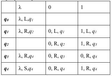 Каждая команда состоит из трёх элементов, разделённых запятыми: первый элемент записываемый в текущую ячейку символ алфавита (может совпадать с тем, который там уже записан). Второй элемент один из трёх символов «L», «R», «S». Символы «L» и «R» означают сдвиг в левую или правую ячейки соответственно, «S» завершение работы исполнителя МТ после выполнения текущей команды. Сдвиг происходит после записи символа в текущую ячейку. Третий элемент новое состояние головки после выполнения команды. Например, команда 0, L, q1 выполняется следующим образом: в текущую ячейку записывается символ «0», затем головка сдвигается в соседнюю слева ячейку и переходит в состояние q1.