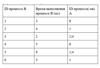 В файле содержится информация о совокупности вычислительных процессов, которые могут выполняться параллельно или последовательно. Будем говорить, что процесс В зависит от процесса А, если для выполнения процесса В необходимы результаты выполнения процесса А. В этом случае процессы могут выполняться только последовательно. Информация о процессах представлена в файле в виде таблицы. В первом столбце таблицы указан идентификатор процесса (ID), во втором столбце таблицы - время его выполнения в миллисекундах, в третьем столбце перечислены с разделителем «;» ID процессов, от которых зависит данный процесс. Если процесс является независимым, то в таблице указано значение 0. Определите максимальную продолжительность отрезка времени (в мс), в течение которого возможно одновременное выполнение пяти процессов, при условии, что все независимые друг от друга процессы могут выполняться параллельно.