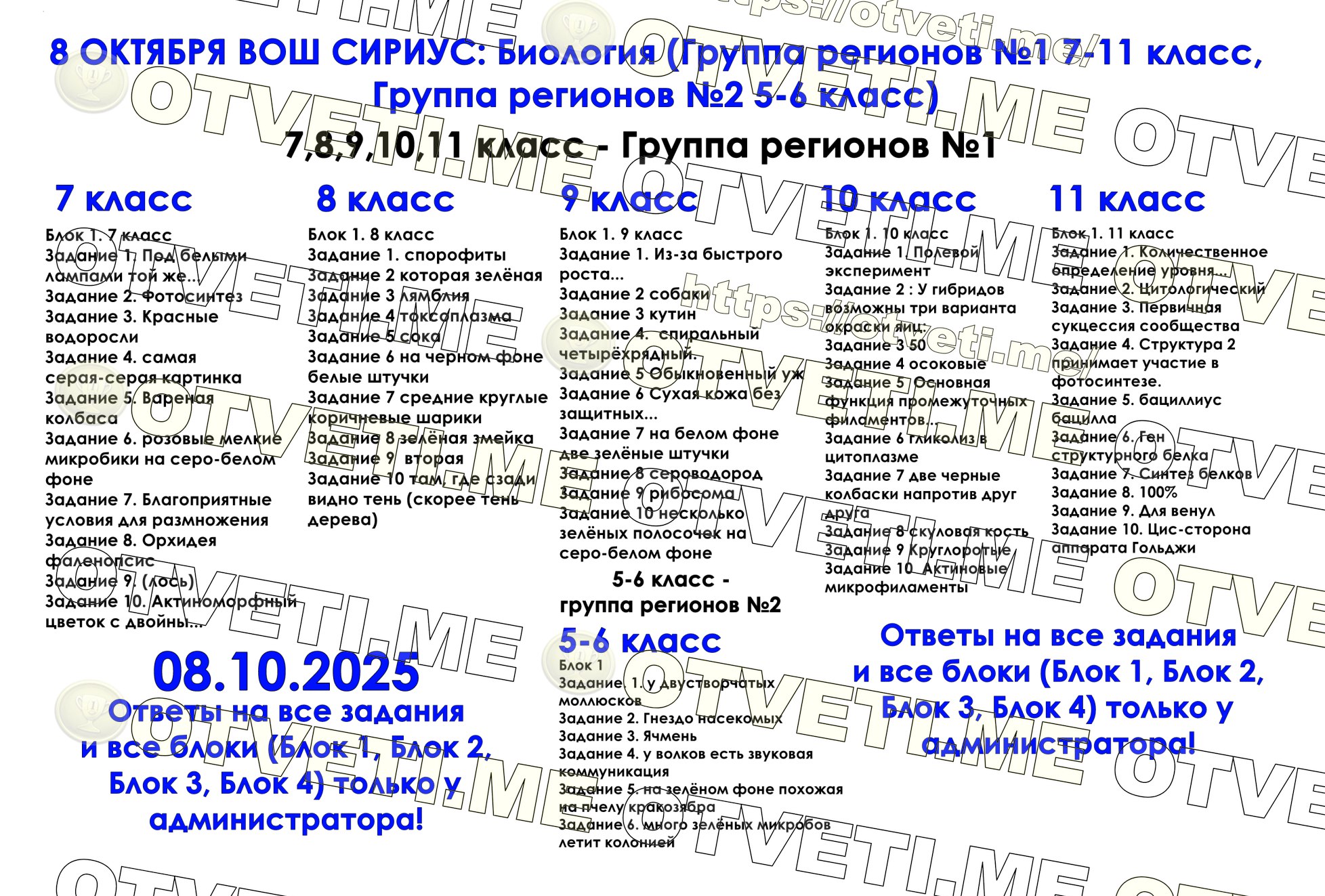 Ответы и решения на все задания для 5 и 6 класса олимпиада по Биологии школьный этап 2025 официальной всероссийской олимпиады школьников ВСОШ для 2 группы регионов Сириус дата проведения 8 октября онлайн на сайте или в школе.