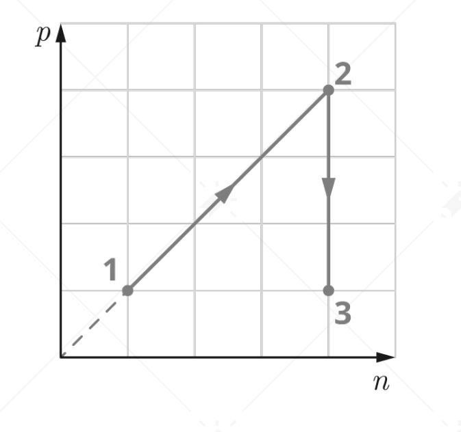 Постоянное количество одноатомного идеального газа участвует в процессе, график которого изображён на рисунке в координатах p-n, где p- давление газа, n его концентрация. Определите, получает газ теплоту или отдаёт в процессах 1-2 и 2-3. Ответ поясните, опираясь на законы молекулярной физики и термодинамики.