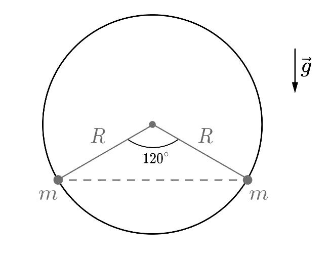 По кольцу радиусом R, расположенному в вертикальной плоскости в поле силы тяжести Земли, могут скользить без трения два одинаковых шарика массой m с одинаковыми зарядами q. Шарики расположились на концах горизонтальной хорды, проходящей ниже центра кольца и стягивающей дугу 120°. Найдите расстояние h от центра кольца до этой хорды. Сделайте рисунок с указанием сил, действующих на шарики.