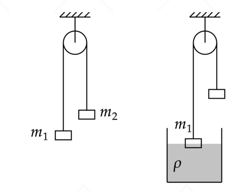 Два тела подвешены за нерастяжимую и невесомую нить к идеальному блоку, как показано на рисунке. При этом первое тело массой m1 движется из состояния покоя вниз с ускорением a = 2 м/с2. Если первое тело опустить в воду с плотностью ρ = 1000 кг/м3, находящуюся в большом объёме, система будет находиться в равновесии. Объём погружённой в воду части тела составляет V = 1,5 * 10-4 м3. Сделайте рисунки с указанием сил. Определите массу первого тела m1. Какие законы Вы используете для решения задачи? Обоснуйте их применение.