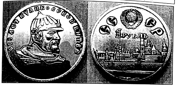 Рассмотрите изображение монеты «600 лет Куликовской битве».