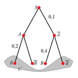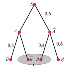 (Данные графа: вероятности ветвей S -> A = 0,9, S -> не A = 0,1. Ветви из A: в B = 0,2, в не B = 0,8. Ветви из не A: в B = 0,4, в не B = 0,6. Выделенное событие С объединяет конечные исходы «A ∩ не B» и «не A ∩ не B»).