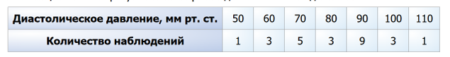 Во время диспансеризации 25 студентам группы измерили артериальное давление систолическое (в момент максимального сокращения сердечной мышцы) и диастолическое (в момент расслабления мышцы). Артериальное давление обычно измеряют с точностью до 10 миллиметров ртутного столба. В таблице показаны результаты измерений диастолического давления.