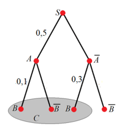 (Данные графа: вероятности ветвей S -> A = 0,5, S -> не A = 0,5. Ветви из A: в B = 0,1, в не B = 0,9. Ветви из не A: в B = 0,3, в не B = 0,7. Выделенное событие С объединяет конечные исходы «A ∩ не B» и «не A ∩ не B»).