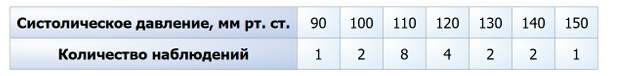 (Данные из таблицы: Количество наблюдений для каждого значения давления от 90 до 150: 90 - 1, 100 - 2, 110 - 8, 120 - 4, 130 - 2, 140 - 2, 150 - 1).