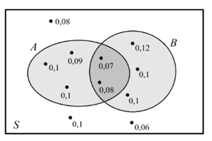 На диаграмме Эйлера изображён случайный опыт S, в котором 10 элементарных событий, показанных точками. Около каждого исхода подписана его вероятность. Найдите условную вероятность P(B|A). Результат округлите до сотых.