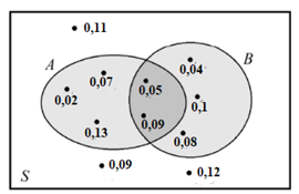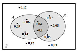 На диаграмме Эйлера изображён случайный опыт S, в котором 11 элементарных событий, показанных точками. Около каждого исхода подписана его вероятность. Найдите условную вероятность P(B|A).