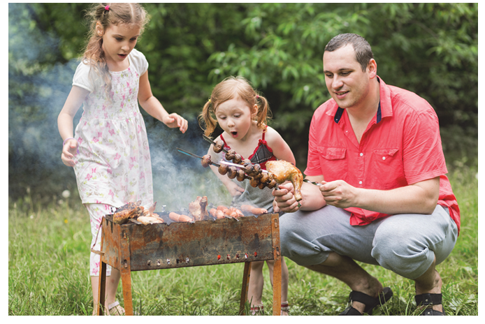 "На этой замечательной фотографии мы видим сцену семейного отдыха на природе. На переднем плане запечатлен отец семейства и две его маленькие дочери, которые с увлечением заняты приготовлением еды на мангале. Действие, очевидно, происходит в теплое время года, возможно летом, на уютной зеленой поляне в парке или за городом. Люди выглядят очень счастливыми: девочки с восторгом и удивлением смотрят на жарящиеся сосиски и мясо, а папа бережно поддерживает шампуры, улыбаясь своим детям. На мой взгляд, преимущества семейного отдыха неоценимы. Совместные поездки на природу помогают отвлечься от городской суеты, укрепляют доверие между родителями и детьми, а также дарят массу положительных эмоций и теплых воспоминаний на долгие годы."