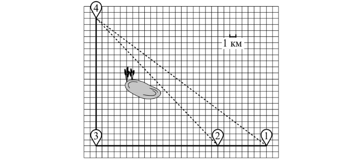 Решение: По шоссе от Грушёвки до Таловки: 2 клетки * 2 км = 4 км. Время = 4 / 15 ч = 16 мин. Тропинка от Таловки до Абрамово: по плану от 3 до 4 - 4 клетки (8 км). Гипотенуза: корень(36+64)=10 км. Скорость по тропинке 12 км/ч. Время = 10/12 ч = 50 мин. Итого 16 + 50 = 66 минут.