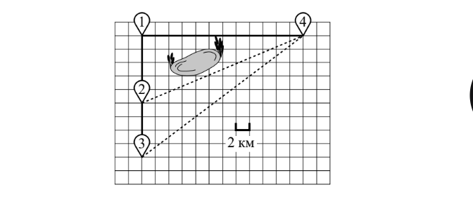 Решение: Катеты: 15 клеток * 2 км = 30 км, 8 клеток * 2 км = 16 км. Гипотенуза: корень из (302 + 162) = корень из (900 + 256) = корень из 1156 = 34 км.