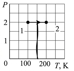 Из уравнения Менделеева-Клапейрона: p = (ρ / M) · R · T. Если график прямой и проходит через начало координат (p пропорционально плотности), то температура T = const (процесс изотермический). Стрелка идет вправо — плотность растет, значит объем V падает (газ сжимают).